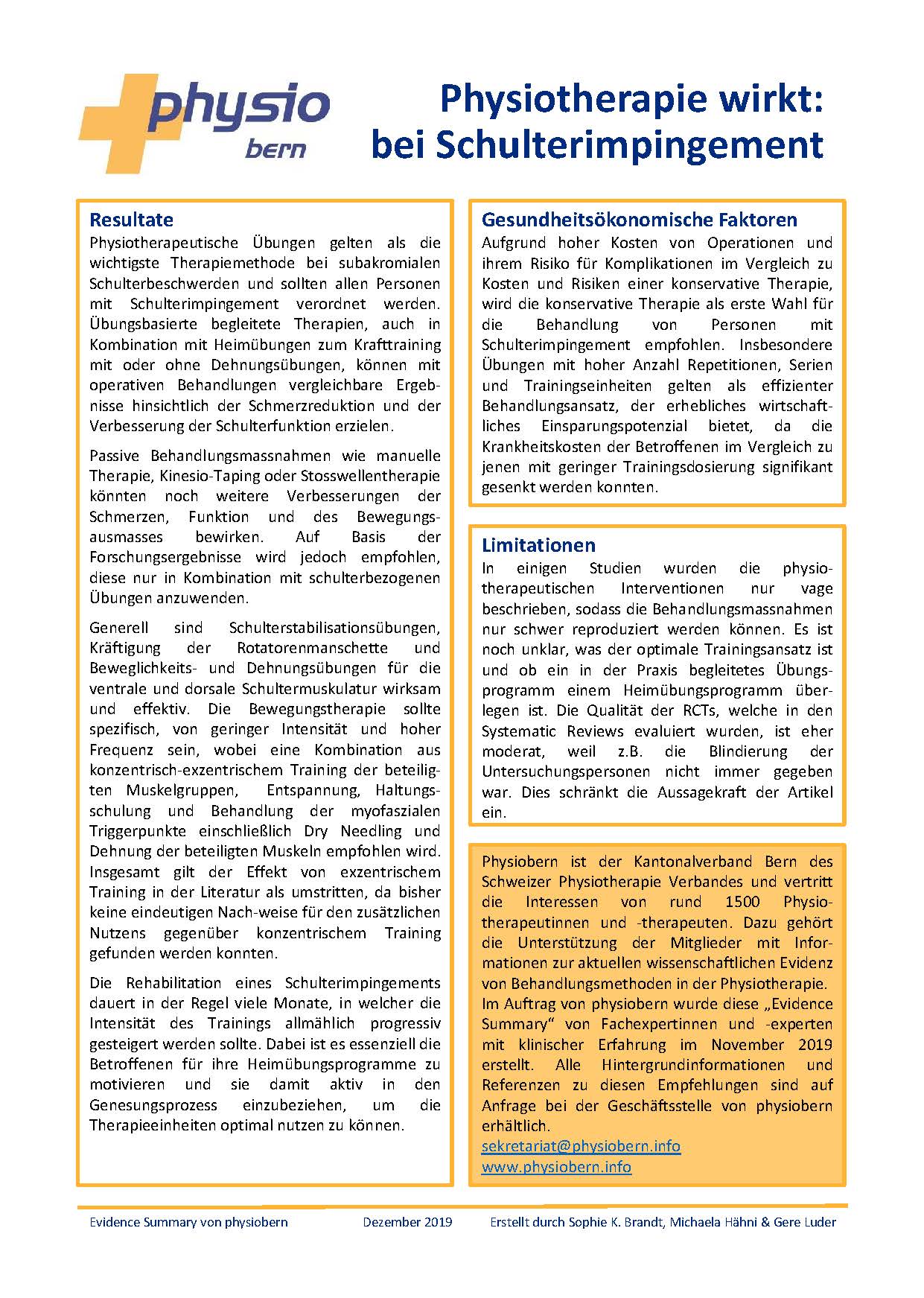 Ein Impingement der Schulter ist eine häufige Ursache für Schulterbeschwerden. Physiotherapie mit gezielten Übungen gilt dabei als wichtigste Therapiemethode und kann mit operativen Behandlungen vergleichbare Ergebnisse bezüglich Schmerz und Funktion erzielen. Stabilisationsübungen, spezifisches Krafttraining, Triggerpunkt-Behandlung und Dehnungsübungen sind wirksam. Der Effekt von exzentrischem Training ist umstritten. Passive Therapiemassnahmen sollten nur in Kombination mit schulterbezogenen Übungen angewendet werden.