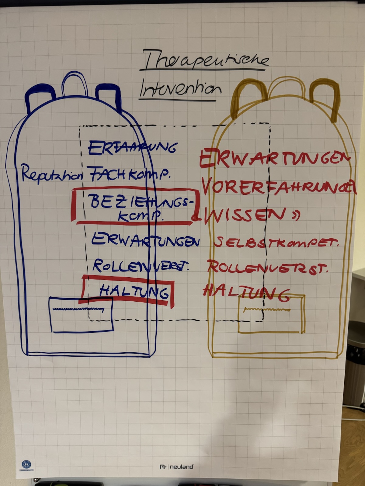 Anschaulich zeigte sie auf, was wir Therapeut:innen und unsere Patient:innen in die Therapie mitbringen: Erfahrung, Fachkompetenz, Beziehungskompetenz, Erwartungen, Rollenverständnis und Haltung. Gleichzeitig machte sie deutlich, dass diese „Rucksäcke“ der Kommunikation dienen können – manchmal aber auch im Weg stehen.