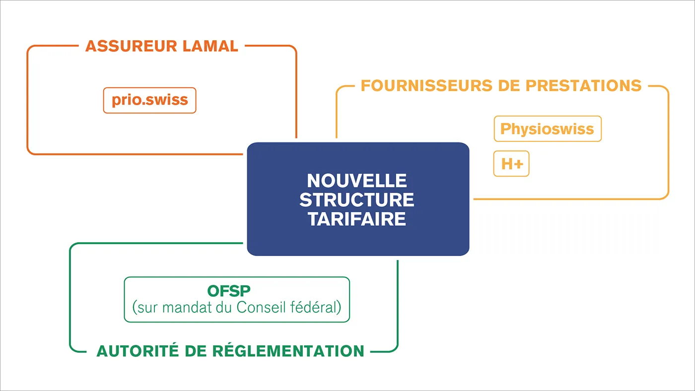 Lors des négociations sur la structure tarifaire, toutes les associations de fournisseurs de prestations ainsi que prio.swiss sont représentées. Les structures tarifaires s’appliquent au niveau national; elles sont donc approuvées par l’OFSP (Office fédéral de la santé publique) ou par le Conseil fédéral. Dans le cadre du processus d’approbation, celui-ci consulte également le Surveillant des prix ainsi que les organisations de patients.