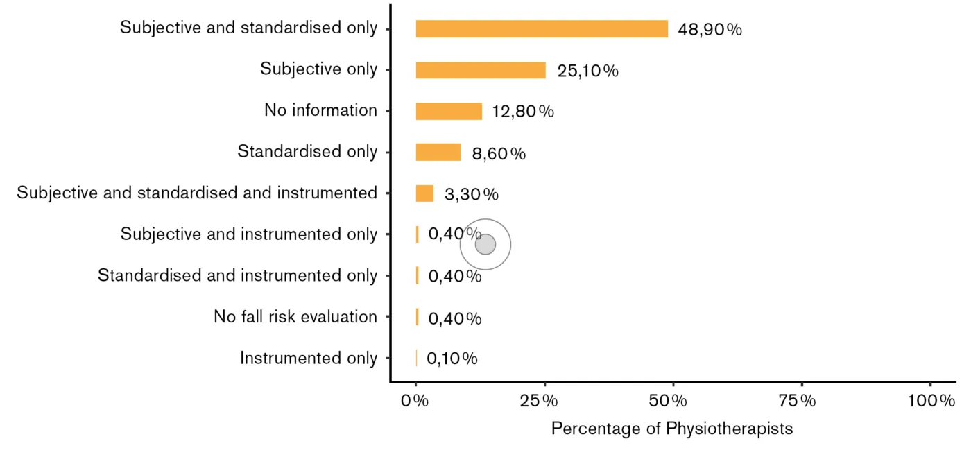 In totale, Morgane Duc ha analizzato le risposte di 938 partecipanti di tutte e tre le regioni linguistiche. In generale, il 62% dei fisioterapisti interpellati utilizzava test o strumenti standardizzati. Il 49% combinava metodi di valutazione soggettivi e standardizzati, come evidenziato nella suddivisione in categorie mutuamente esclusive (figura 2). Il 25% dei fisioterapisti effettuava però solo una valutazione soggettiva, fondata in sostanza sull’osservazione. Per i partecipanti che operavano in ospedali, cliniche e case di riposo, la probabilità di utilizzo di una valutazione standardizzata era 1,93 volte superiore rispetto a coloro che lavoravano negli studi privati.