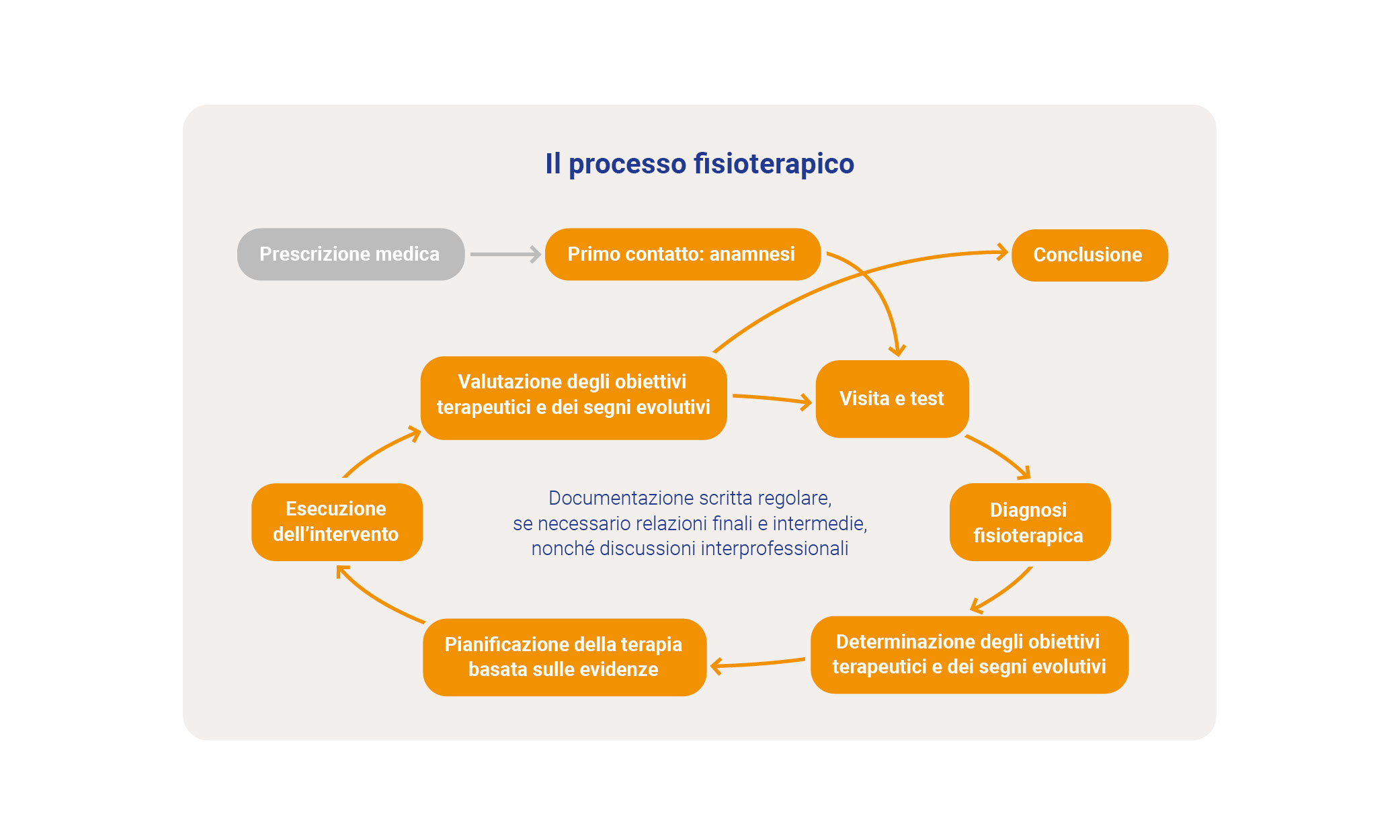 Nel processo fisioterapico le pazienti e i pazienti vengono accompagnati passo dopo passo seguendo una procedura chiaramente strutturata, dal primo incontro fino alla conclusione
