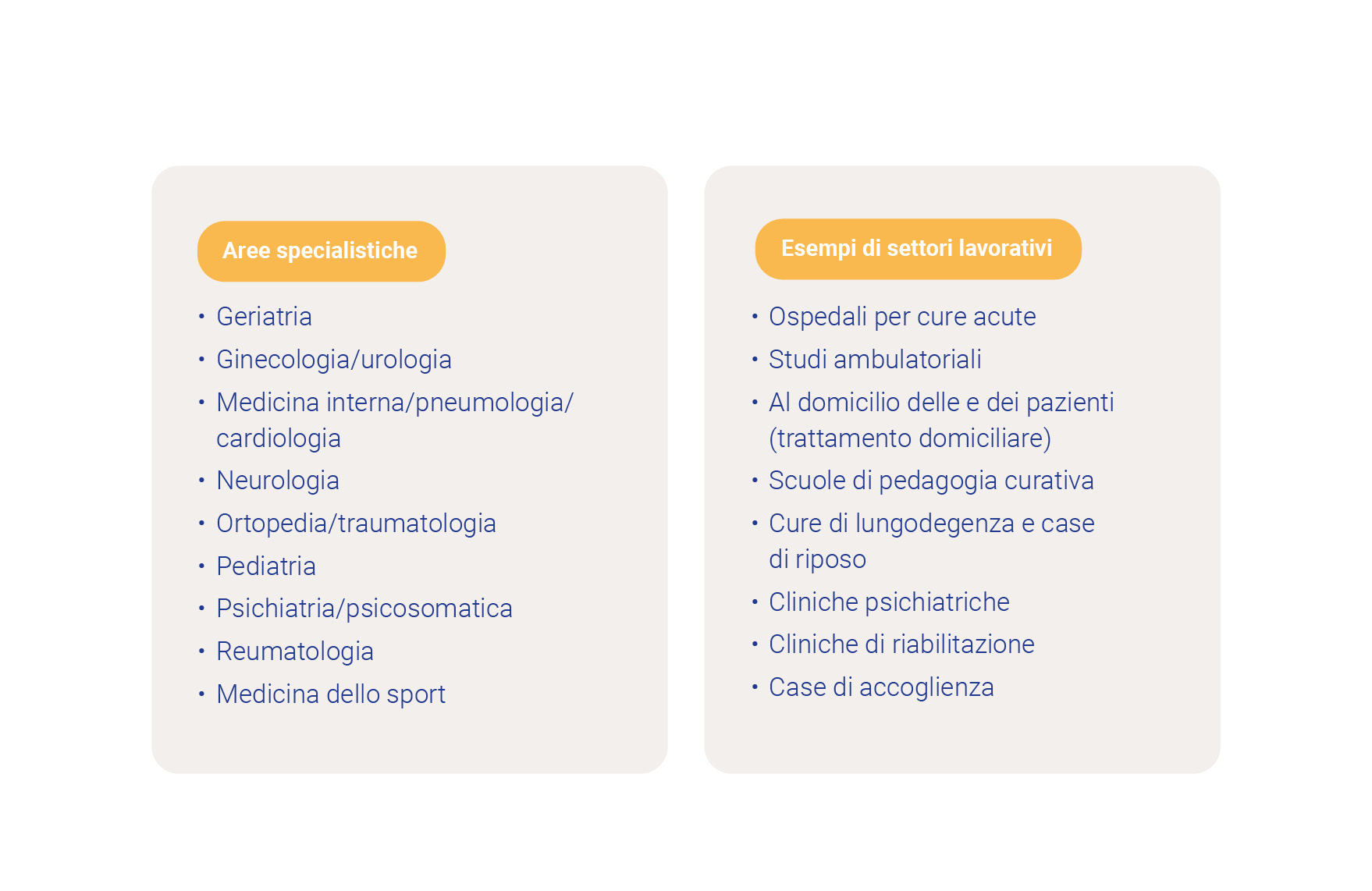 I fisioterapisti sono attivi nei settori della terapia, della riabilitazione, delle cure palliative, della prevenzione e della promozione della salute. Trattano pazienti di varie aree specialistiche e lavorano in diversi settori, come mostra la tabella seguente.