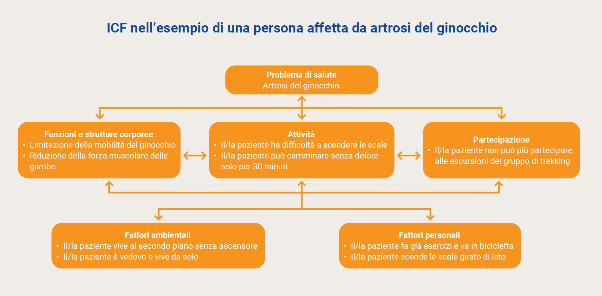 L’ICF comprende strutture e funzioni corporee, attività e partecipazione. Vengono inoltre presi in considerazione i fattori ambientali e personali. Questo approccio aiuta quindi a comprendere meglio l’impatto che i problemi di salute esercitano sulla vita quotidiana e costituisce uno strumento importante per la pianificazione delle misure terapeutiche e riabilitative nella fisioterapia. Nella figura seguente viene descritta l’ICF utilizzando l’esempio di una persona affetta da artrosi del ginocchio.